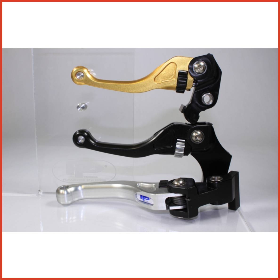 Adjustable levers are C.N.C. machined from solid billet aluminium ergal. In the most stressed places there are pressed waterproof  ball bearings. Special richness in lightening guarantees the minimum weight by maximum of strength and much better air circulation to reach the top speed. Unbreakable pivot design. All bolds, nuts, pivots and springs are made of solid stainless steel material. Adjustable mechanism allows smooth adjustment of the lever in positions form 0,5mm after the 0 point to the maximum of 8cm. This unique range of adjustment doesn’t offer any other producer on the word market. Available in five coloured variation (black, silver, gold, blue and red)
