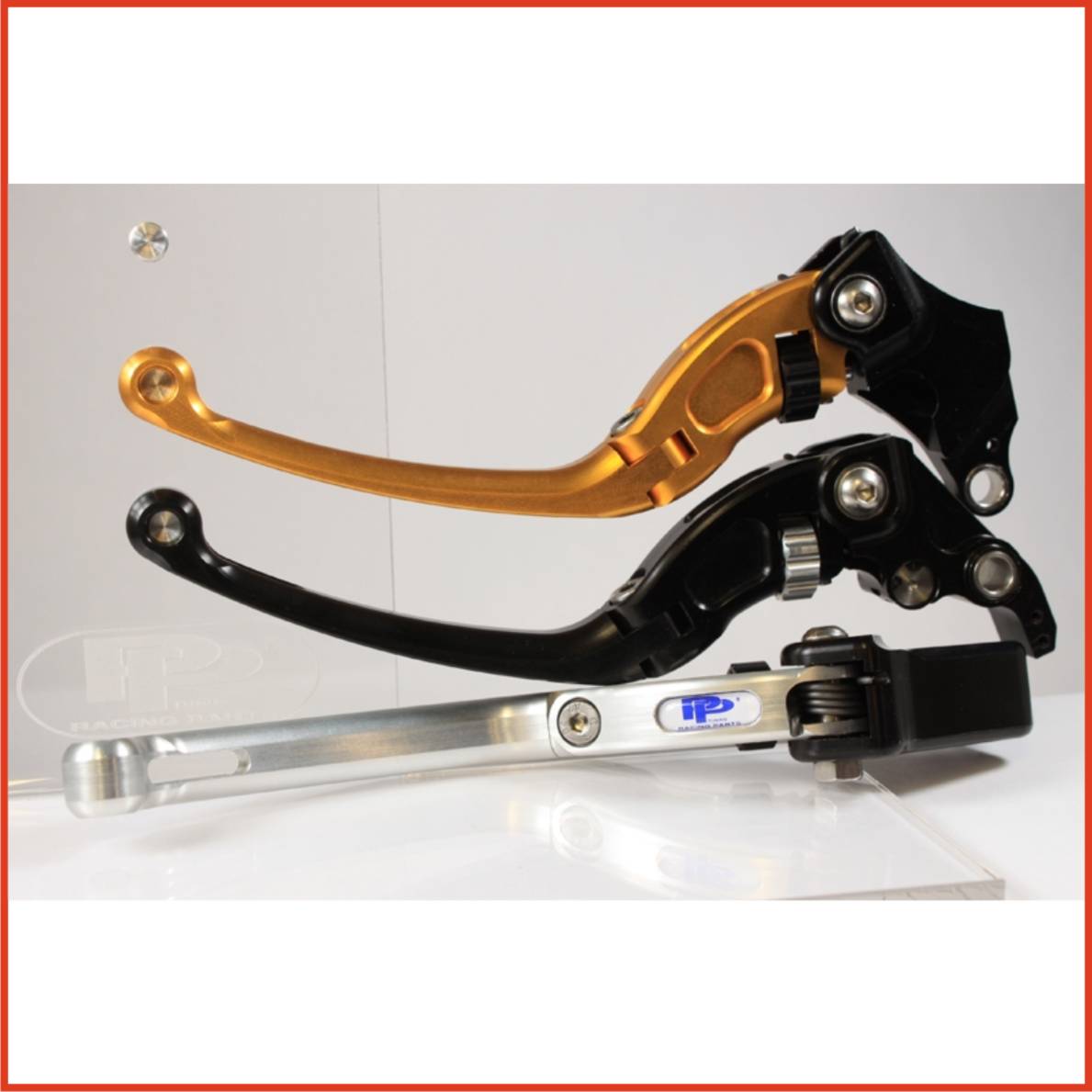 Adjustable levers are C.N.C. machined from solid billet aluminium ergal. In the most stressed places there are pressed waterproof ball bearings. Special richness in lightening guarantees the minimum weight by maximum of strength and much better air circulation to reach the top speed. Unbreakable pivot design. All bolds, nuts, pivots and springs are made of solid stainless steel material. Adjustable mechanism allows smooth adjustment of the lever in positions form 0,5mm after the 0 point to the maximum of 8cm. This unique range of adjustment doesn’t offer any other producer on the word market. Available in five coloured variation (black, silver, gold, blue and red)
