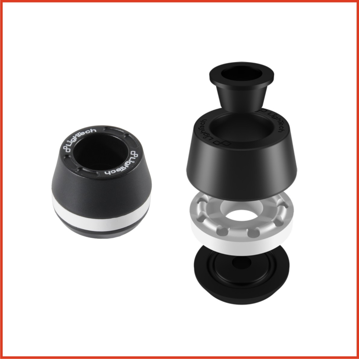 In an innovative step in reducing crash damage, LighTech introduced frame sliders with rubber shock absorbers. By combining a Magnesium base plate with a soft rubber center and an external puck made of nylon mixed with fiberglass, LighTech frame sliders have excellent sliding capabilities while cushioning the blow upon impact. Magnesium also reacts better to shock, unlike standard run of the mill long delrin or aluminum pucks which transfer the shock from crash directly to mounting point. Magnesium is softer than aluminum or delrin which offers much better protection to the bike as it will absorb the impact of a crash.