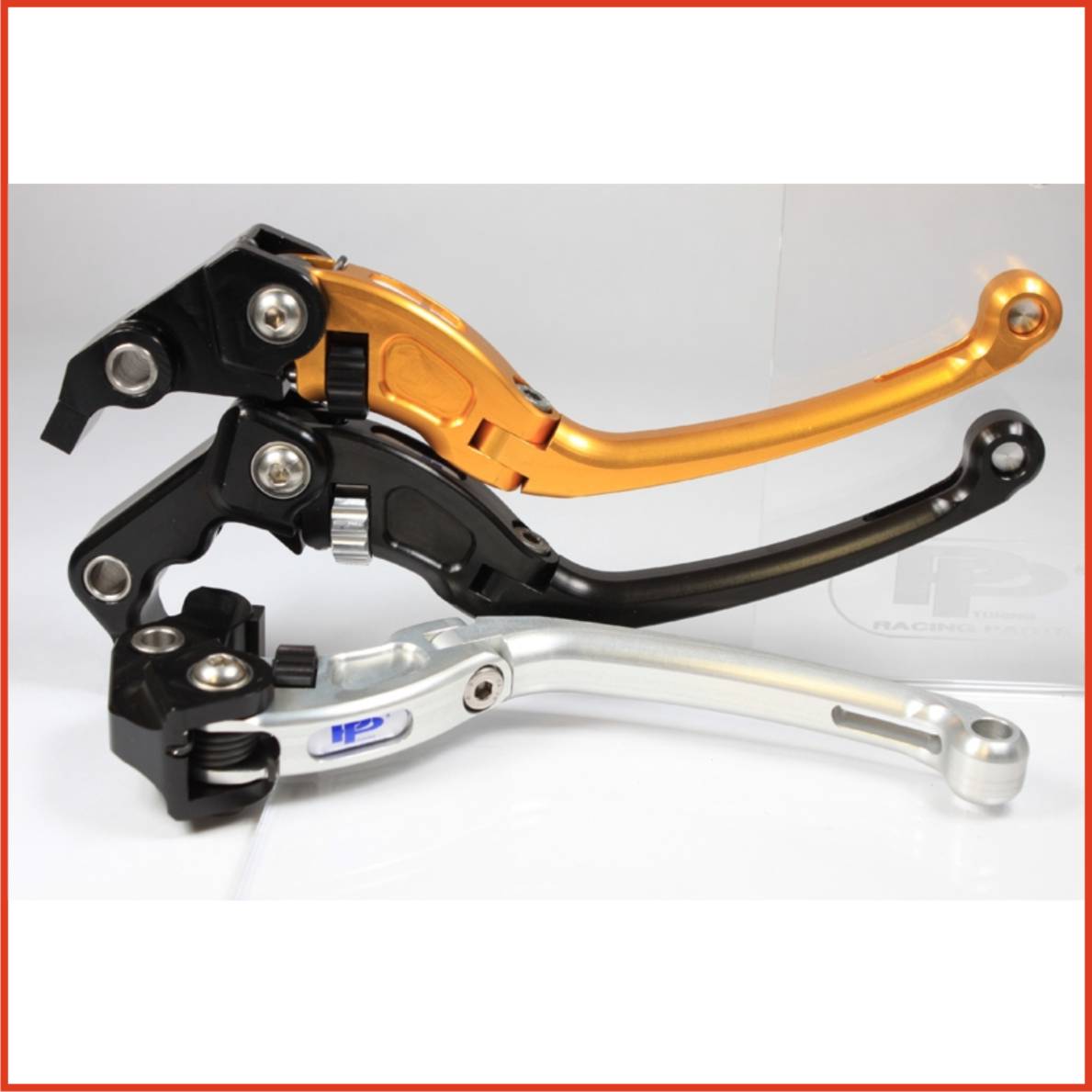 Adjustable levers are C.N.C. machined from solid billet aluminium ergal. In the most stressed places there are pressed waterproof ball bearings. Special richness in lightening guarantees the minimum weight by maximum of strength and much better air circulation to reach the top speed. Unbreakable pivot design. All bolds, nuts, pivots and springs are made of solid stainless steel material. Adjustable mechanism allows smooth adjustment of the lever in positions form 0,5mm after the 0 point to the maximum of 8cm. This unique range of adjustment doesn’t offer any other producer on the word market. Available in five coloured variation (black, silver, gold, blue and red)