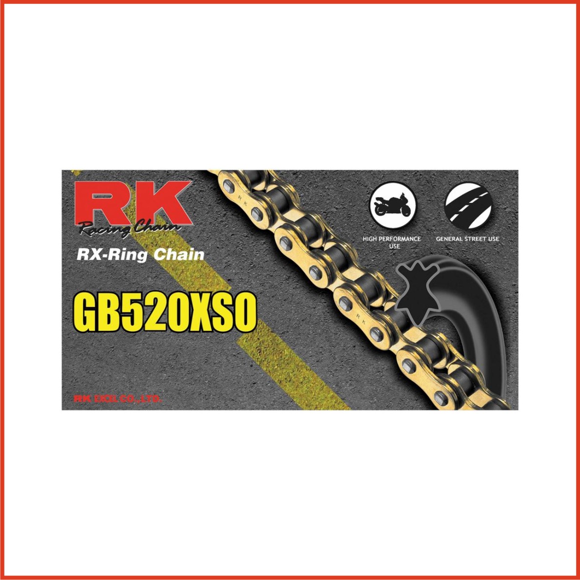 RK GB520 XSO Application: Street and Dirt. As part of their continuing quality improvement program, the RK Chain Factory has made a running production upgrade to their best selling 520XSO chain. The new upgrade GBXSO and non-gold XSO chains features RK’s proprietary “RX-Ring” seal design and is offered in 520, 525 & 530. All versions are available in either gold/gold or standard steel color. Viewed in cross-section, the RK “RX-Ring” has two lubrication pools and seal points versus the single seal point/pool design of a regular o-ring chain. RK’s new GBXSO chains offer quality,performance and unbeatable value, for all but the most demanding high performance application.